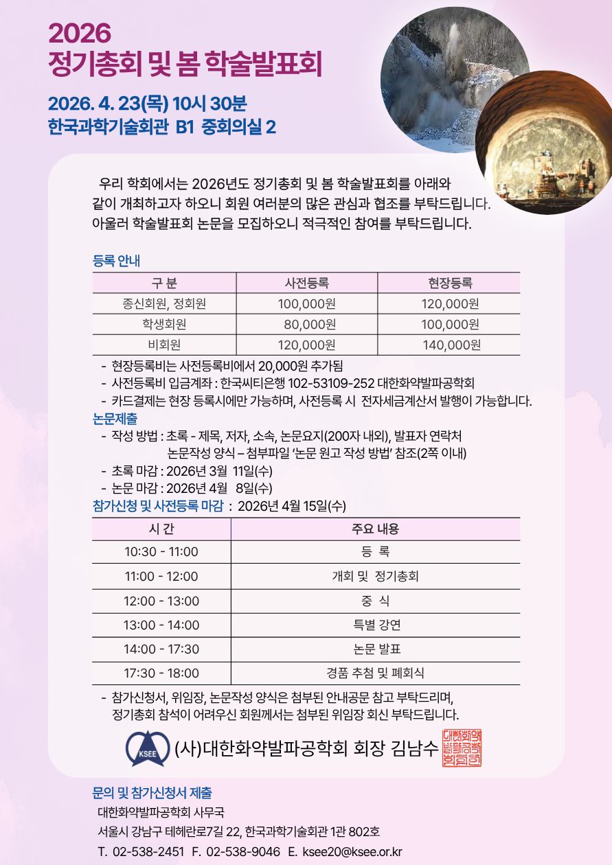 본 학회에서는 2026년 정기총회 및 봄학술발표회를 개최함에 따라, 학문 및 기술 발전을 도모하고 회원 상호 간의 연구 성과를 공유하고자 학술발표 논문을 모집하고자 합니다.